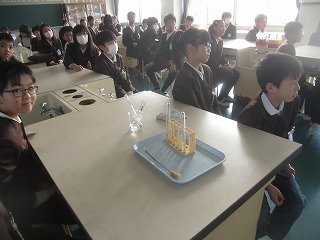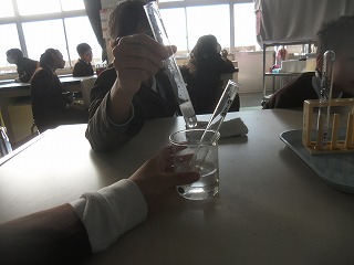 6年生は理科で酸性やアルカリ性について学習しています。今日は、キッチンハイターを溶かした水溶液に、鉄とアルミを入れてどうなるか実験しました。