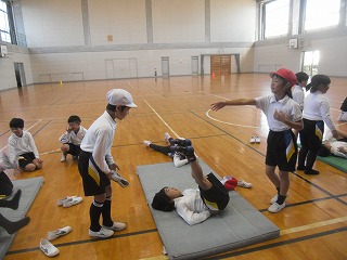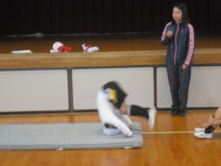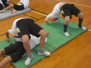 2年生の体育はマット運動になっています。先日の壁倒立の他にも、しゃがんだ状態から後ろに転がってまた元に戻る「起き上がり小法師(おきあがりこぼし)」、手で腰を支えて肩で行う「アンテナ倒立」、ブリッジ、前転などに挑戦しました。