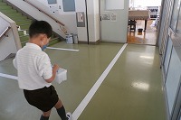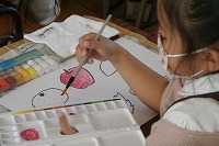 1年生が図工で絵の具の使い方を学習していました。すでに、絵の具自体は色水づくりや紙粘土に混ぜて色を変えるために使っていますが、パレットに出して水で溶いて紙に筆で描くのは初めてです。子どもたちは水入れに水を入れて運ぶところから恐る恐る取り組んでいました。