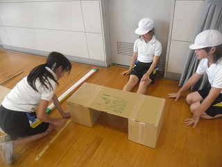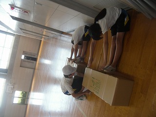 6年生が、体力テストの一環で長座体前屈の記録をとっていました。前の年より柔らかくなっているかな?