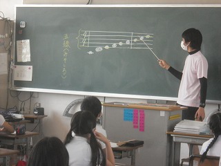 4年生が音楽で、楽譜の見方の学習をしていました。五線譜に音符を書くと、下から「ミ」「ソ」「シ」「レ」となります。続けて言うと「味噌汁(みそしる)」みたいなので覚えやすいですね。