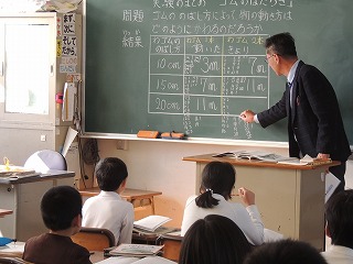 3年生は、理科の実験で、ゴムをのばし方によって物の動きはどうかわるのか表にしてまとめ、ゴムのはたらきについて予想しました。