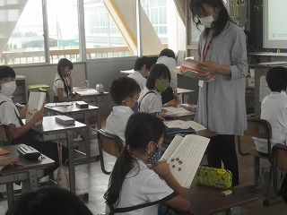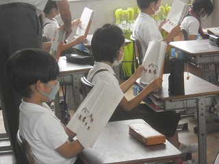 3年生が国語で「独楽(こま)」について学習していました。いろいろな種類の独楽の写真を見ながら、大きさや形、色や独楽の特徴が書いてある説明文の学習です。