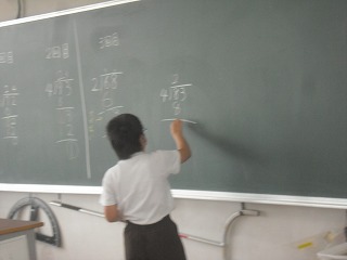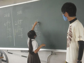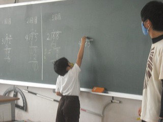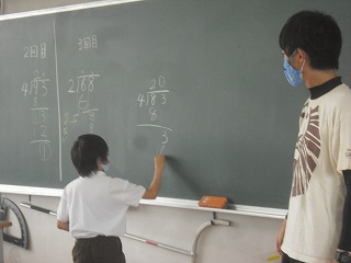 4年生が、割り算の筆算の学習で、数人で協力して計算を完成させていました。