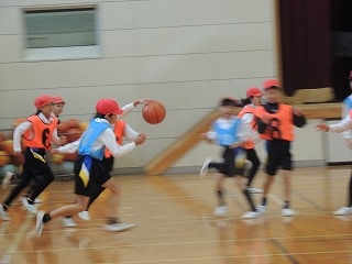 4年生の体育はバスケットボールでした。チームに分かれて、2つのコートで試合をしていました。