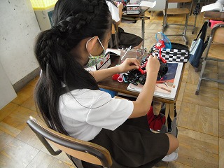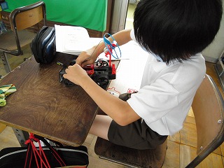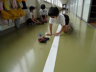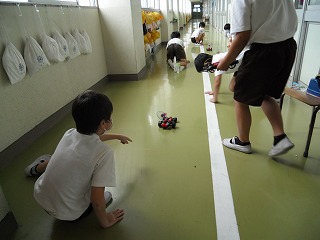 で実験をしていました。今日は、より速く走るための工夫です。電池をどのようにつなぐと速く走るのか、いろいろなつなぎ方をして何度も走らせていました。