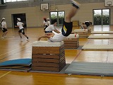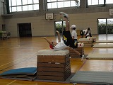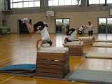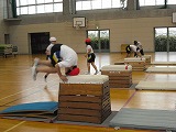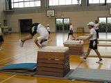 後半の方の子は膝が伸びていますが、台上前転から首跳ね跳び(首跳ね起き)に発展していっています。