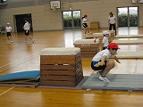5年生が体育で跳び箱を使って台上前転に挑戦していました。開脚跳びは常に前を見ているのでそれほど恐怖心を感じませんが、台上で回転すると、前を見られない時間が出てしまい、一気に怖くなってしまう子が増えます。子どもたちは跳び箱の高さをいろいろ変えながら、自分のできることを増やしていきました。