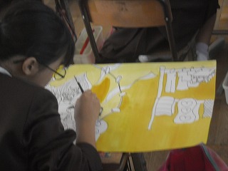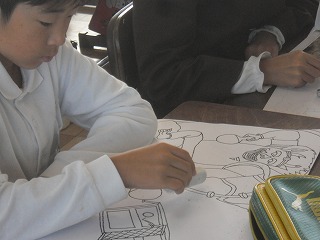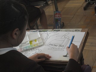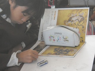 5年生の風神雷神図をもとにしたオリジナルの絵が清書に入っています。風神、または雷神の姿を何に見立てて描くか、出来上がりが楽しみです。