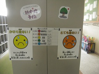 数年前から、暑い時期には熱中症に注意するための掲示をしていますが、今年は掲示の仕方を変えました。現在の状態をはっきりと見やすくするために、表示を大きくしたのです。