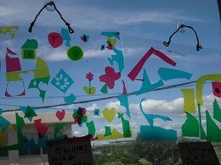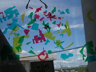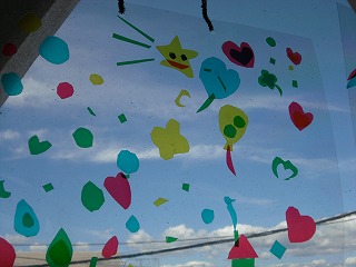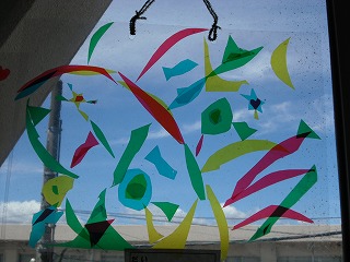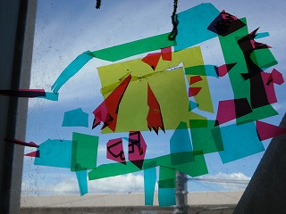 」が完成し始めました。廊下の窓に貼ってあるので、ステンドグラスのようにカラフルできれいです。