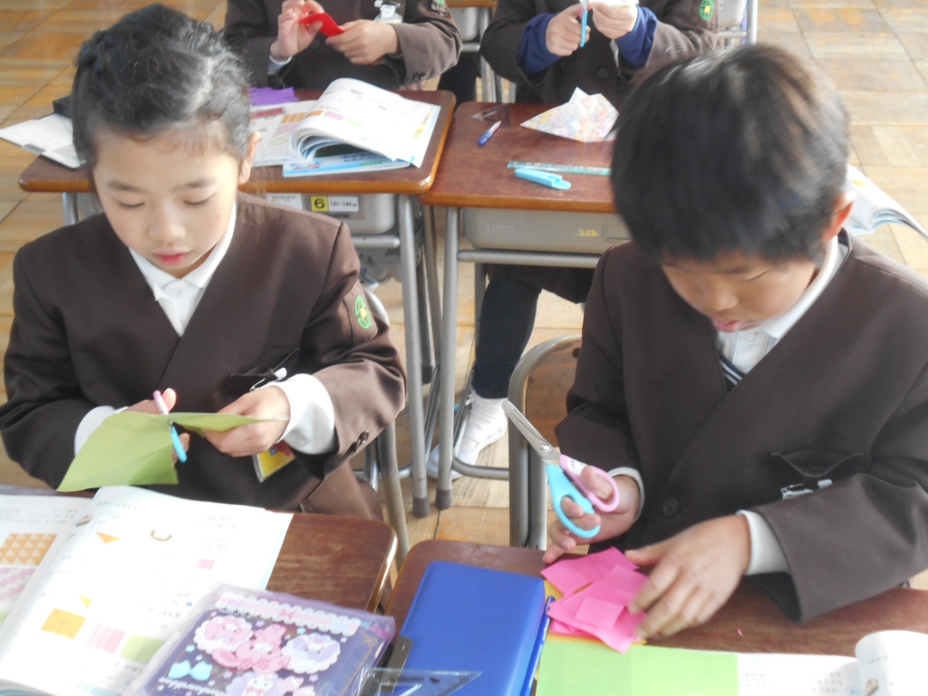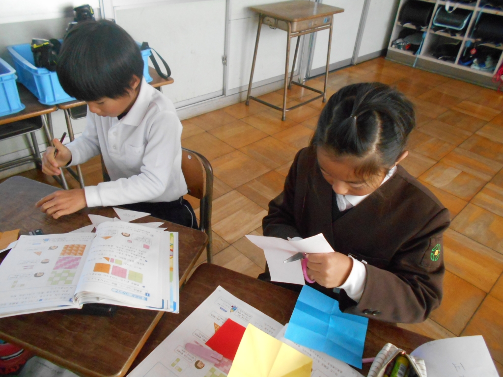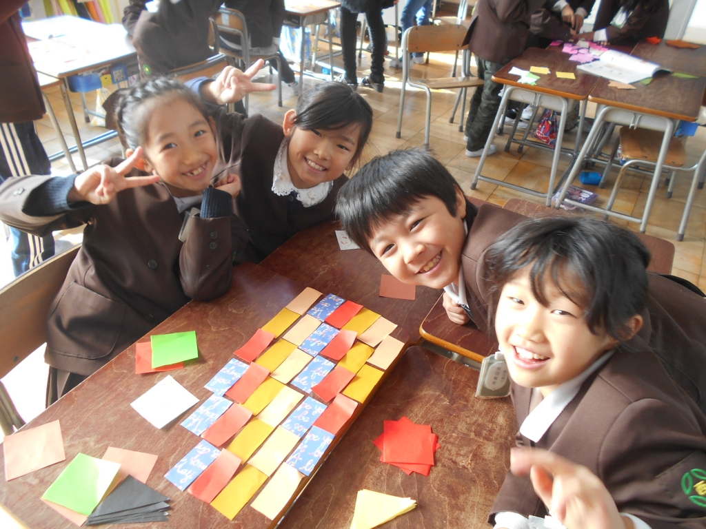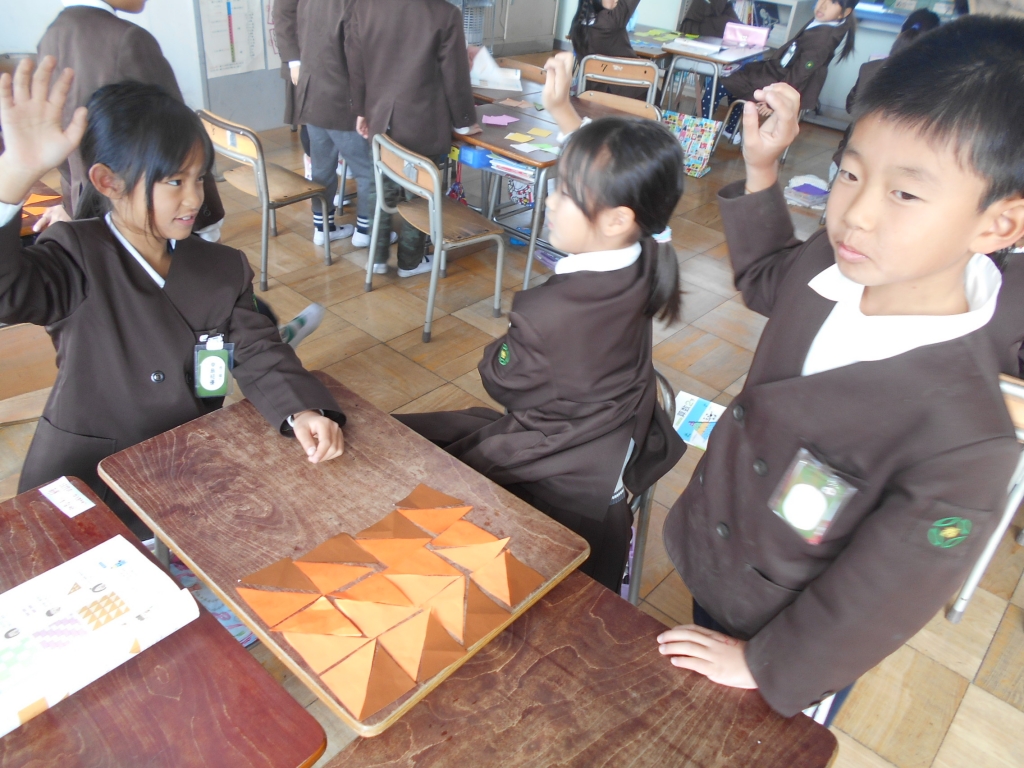 また、色紙を使って、正方形、長方形、直角三角形を作り、作った形を敷き詰めました。