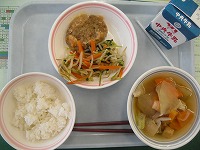 今日は食育の日です。愛西市や愛知県の食べ物をたくさん取り入れました。ハンバーグの味噌トマトソースには、愛知県産のトマトを使いました。トマトの酸味と旨味が味噌に合わさることで、ハンバーグにぴったりなおいしいソースになります。