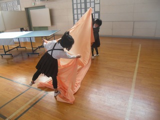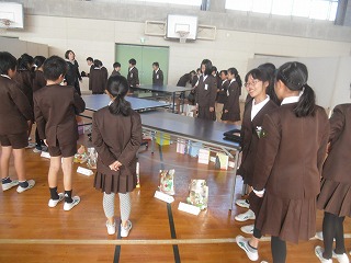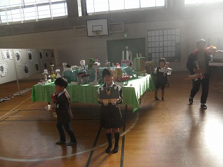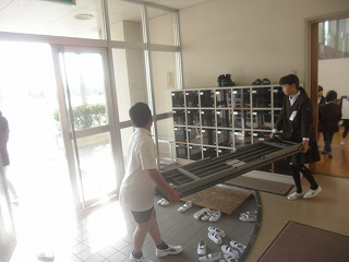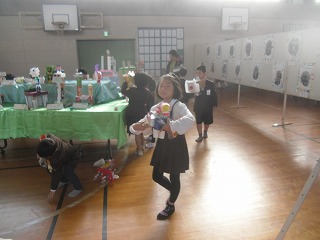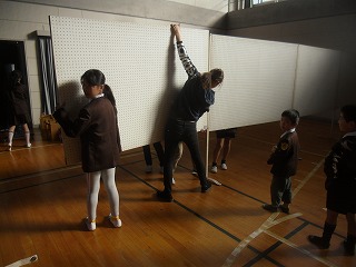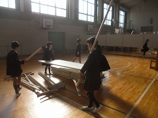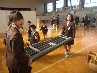 作品展が終わり、体育館を使えるように、各学年の片づけが始まりました。小物は低学年の子が中心に片づけ、大きなものは高学年の子が力を発揮します。