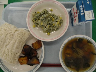 五目うどん 牛乳 大根とささみの紫蘇和え 大学いも