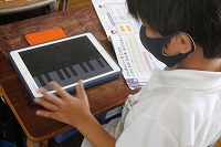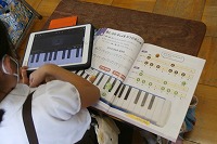 1年生が音楽でタブレットのアプリを使って、鍵盤と音の関係を学習していました。
