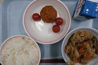 ご飯 牛乳 茄子味噌ミンチカツ 里芋と切干大根の煮物 ミニトマト