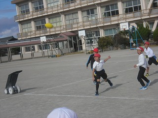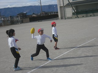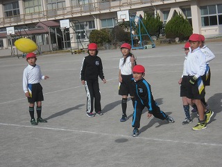 2年生がラグビーボール(タグラグビー用の柔かいもの)を使ってドッジボールをしていました。うまくキャッチすればいいのですが、下におちてしまうと、予想外の方向に転がって拾いに行くのが大変です。