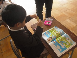 1年生が三角形の色板を使って、パズルをしていました。色板の向きをどうするか表裏をどうするかで、パズルにはまるかどうかが変わってきます。