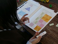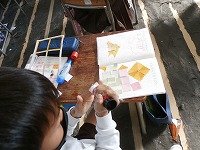 2年生が算数で、いろいろな形の色紙を使ってモザイクのような模様を作っていました。同じ形の図形を敷き詰めるように並べますが、いろいろな色があるので組み合わせ方で違う模様に見えます。三角形と三角形を組み合わせて四角形ができたり、長方形を組み合わせて正方形ができたりと、いろいろな組み合わせ方に気がつきます。