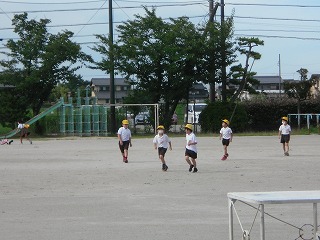 昨日は、久しぶりに運動場で遊ぶことができました。今までは、少し雨がやんでいても運動場の状態が悪くて遊べなかったのですが、久しぶりに使用禁止の赤旗がとれたのです。みんなとても元気に楽しそうに走り回っていました。
