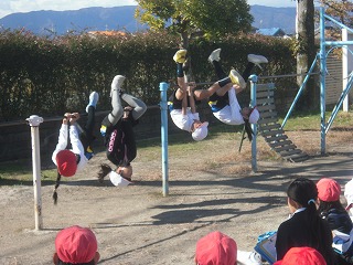 3年生は体育で鉄棒に取り組んでいます。今日は、班ごとに発表会を行っていました。班員が全員で見せたり、個人でできる種目を見せたりと、班で構成を工夫していました。