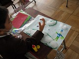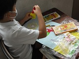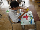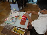 2年生が図工で「ざいりょうからひらめき」に取り組んでいます。綿や波型のボール紙、しわしわの紙、セロハンなど家から持ってきたいろいろな材料や、配付された材料を見てイメージした絵を画用紙に貼りながら作成しています。同じような材料があっても、全く違う絵になるのは面白いですね。