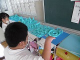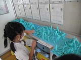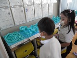 を名札をつけて展示しました。粘土を細長く伸ばしてひもにしたものを使って作ったので、作品名に「くねくね」や「へび」などの名前がついているものが多くありました。