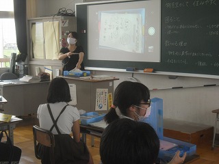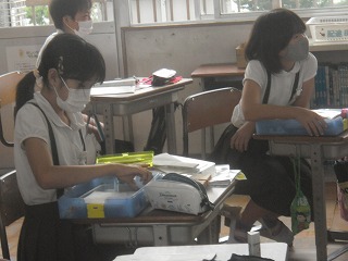 6年生が家庭科で住みやすい生活のための「片づけ方」について考えていました。まずは身近な、教室の自分の机にある道具箱について点検していました。