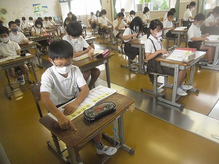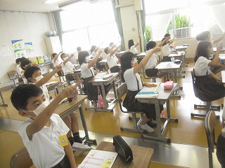 5年生が、国語の漢字の練習で、指を使って徹底的に覚える努力をしていました。漢字ドリルでなぞり書きをし、机の上で指で書き、空中で頭の中に想像しながら書く練習をして、実際に書いてみます。机の上や空中で書く時も、止め、はね、はらいに注意をして、書き順にも気をつけながら書いています。