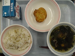 ご飯 牛乳 うめちりごはん 大豆フライ 沢煮椀