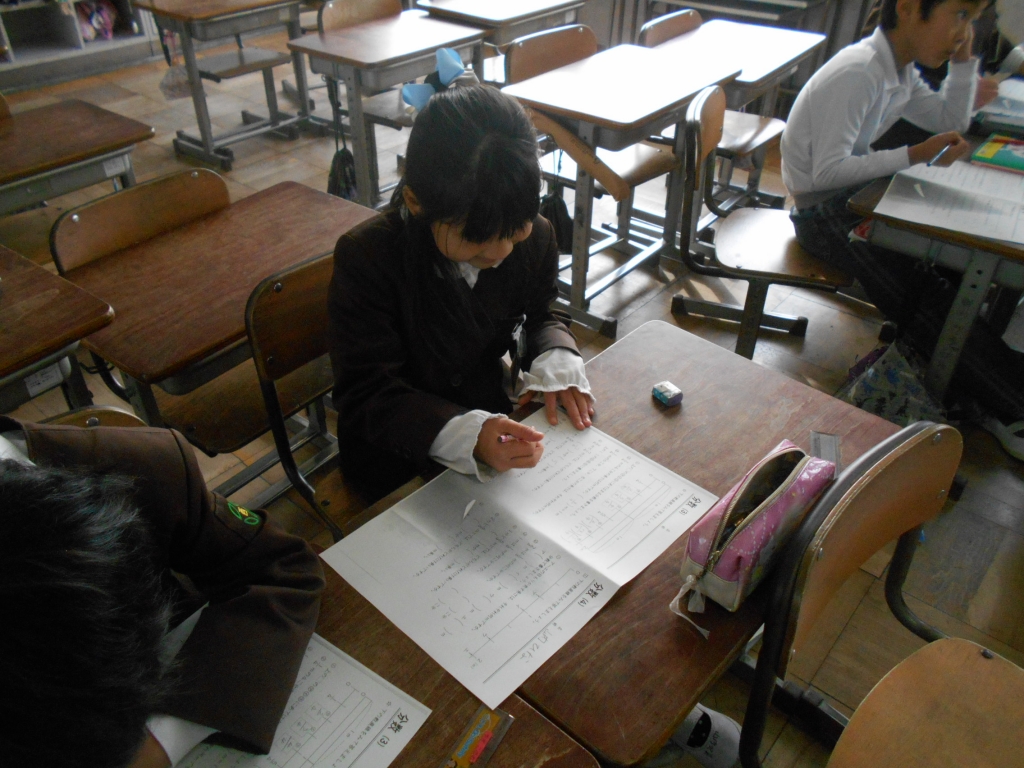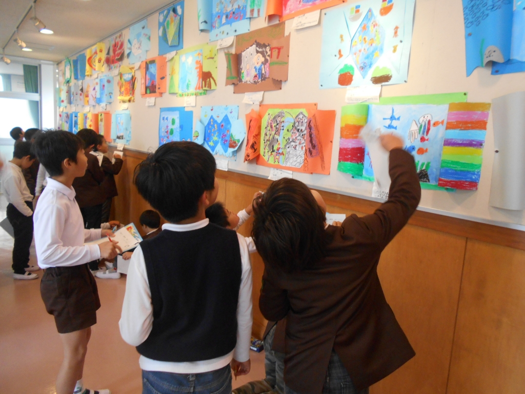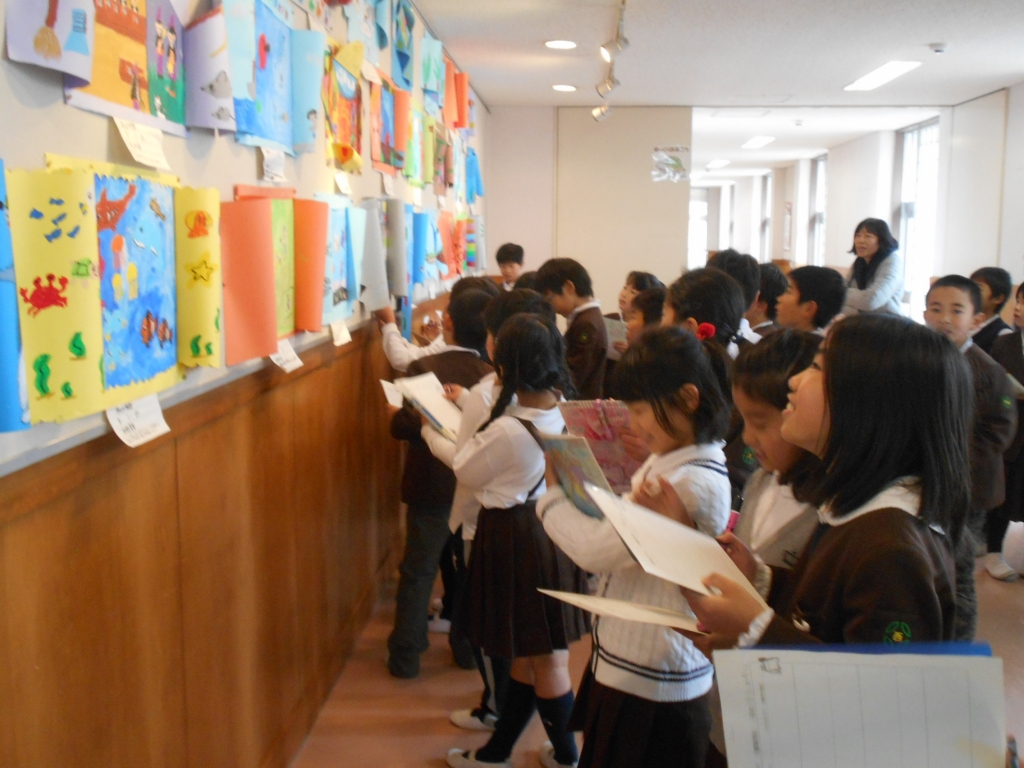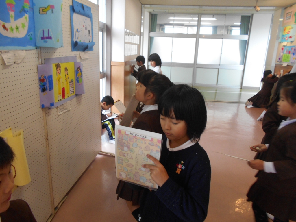 3年生は、分数のまとめに入っています。プリントの問題を解いて確認します。図工では、ギャラリーに掲示してある友達の作品を鑑賞しました。良いところを見つけてプリントに書きました。