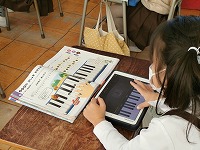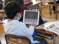1年生がタブレットに入っているアプリを使って鍵盤の練習をしていました。最初は親指(1の指)、人差し指(2の指)、中指(3の指)を使って、ドレミ~ミレド・・・と、指を順に使って音を出していきます。