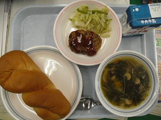 愛知のツイストロール 牛乳 ハンバーグケチャップソースがけ キャベツソテー アルファベットスープ