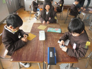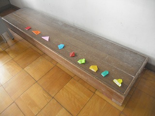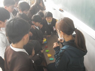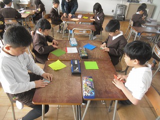 1年生が複雑な折り紙に挑戦していました。難しいので、先生が段階ごとに見本を作り、一つ一つ見せながら説明します。段階ごとに色分けして、「今、何色の段階?」と説明したり質問したりしやすくして、みんなが一緒にできるように工夫しています。