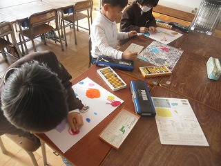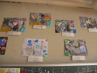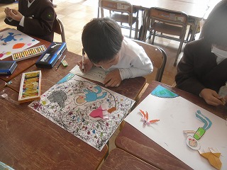 1年生は図工で宇宙旅行の絵を描いています。