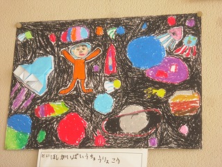 、宇宙飛行士は別の紙に描いて切って貼ります。背景の宇宙や星をクレパスで描きました。