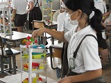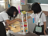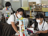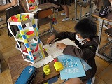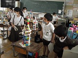 4年生が図工で作った「コロコロガーレ」をお互いに鑑賞しあっていました。色や通り道のデザインだけでなく、実際にビー玉を転がしたりして作品の良いところを見つけていました。