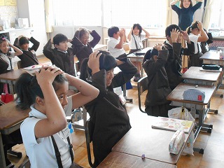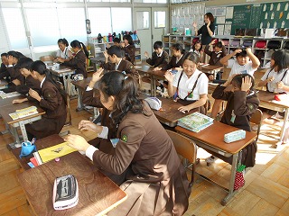 覚えたら、みんなで聞き取り競争です。先生が言ういろいろな教科を聞いて、最初に決めた教科が聞こえたら、隣同士の二人の間に置いた目標を取ります。決めた教科でない場合は、みんなで復唱します。いつ正しい教科が言われるかわからないので、集中して聞き、何度もまねをして復唱するので、イントネーションを含めて覚えていくようです。