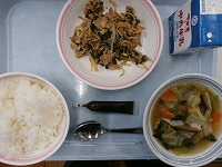 ご飯 牛乳 ピビンパ(肉炒め、ナムル) 中華スープ コーヒー牛乳の素