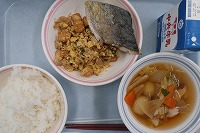 ご飯 牛乳 シイラの塩焼き ゴーヤーチャンプルー ジャガイモ団子汁