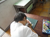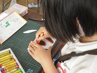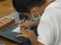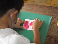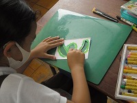 2年生が図工でステンシルに挑戦していました。厚紙を花の形にカッターナイフでくりぬき、周りにクレヨンで色を付けます。そのあと画用紙の上で、穴の中にクレヨンの色を伸ばすようにすると、きれいなグラデーションの花ができるのです。
