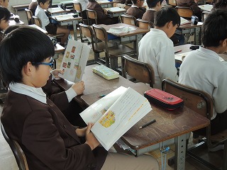 3年生は国語で、「三年とうげ」の朗読を聞きながら、教科書を黙読しました。