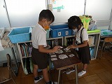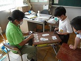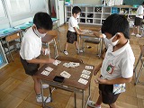 2時間目の放課など長い休み時間は、子どもたちが外で遊べる時間です。ですが、最近は気温が高く、熱中症指数が「危険レベル」まで達することが多くなっています。夏の授業の期間はもともと昼放課の外遊びをなしにしていましたが、午前中の2時間目の放課の時間にすでに「危険レベル」になることもあります。それで、静かに室内で過ごすために、2年生はトランプを始めました。