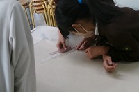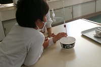 4年生が理科で「水」についての実験をしてインした。水が温度によって起こす変化を調べます。温度が上がると、体積がどう変わるか、試験管に入れた水を温めることで調べました。そのままでは変化が見にくいので、試験管に細いガラス管を差し込みます。ガラス管のほうが細いので、試験管内の水位の変化が拡大されてわかりやすくなるのです。