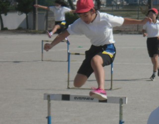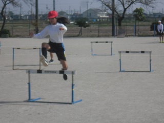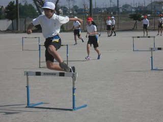 6年生が体育でハードルに取り組んでいました。等間隔(コースごとに間隔を変えてあります)に並べたハードルの中から、自分の歩幅にあったコースを選び、リズムよく跳んでいく練習です。