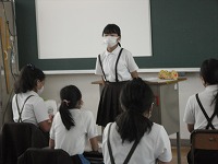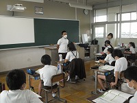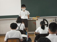 6年生は、質問されたことに対して英語で答える発表を行っていました。名前や住んでいるところ、できること、好きなもの、宝物など基本は決まった質問ですが、最後の宝物については、なぜそれが宝物なのか、自分で理由を話します。どんな理由にするかはそれぞれで考えて決めるので、最後の一文は聞き逃すことができません。