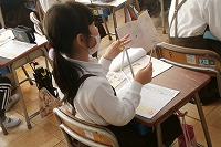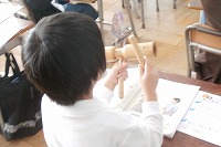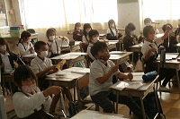 2年生が音楽でリズムをとる練習をしていました。トライアングルやウッドブロックを使って、先生が指示したリズムをきちんとたたけるか、いろいろなリズムで楽しく音を刻んでいました。