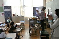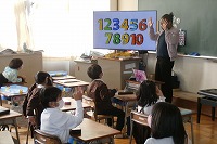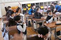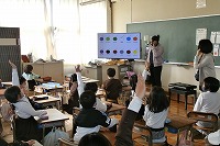 先日は1年生が、ALTのシェリー先生と英語で遊びました。身の回りにあるいろいろな色を見て、英語で何というか答えます。みんな楽しそうに誰が答えても拍手をして応援していました。