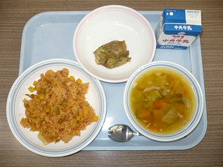 豆々ピラフ 牛乳 鶏肉のバジル風味焼き カボチャ入り野菜スープ